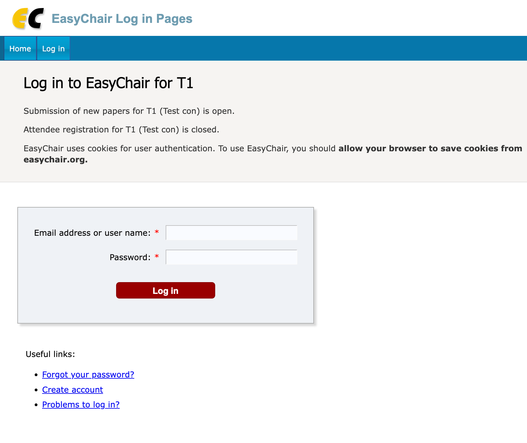 If you have followed all the steps the steps above and you are not logged in to EasyChair, EasyChair will ask you to log in. You will see something like this: